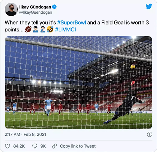 �������� หลังจบ 90 นาที กุนโดกัน ได้ล้อเลียนตัวเองผ่านทวิตเตอร์ ด้วยการโพสต์ภาพซัดจุดโทษข้ามคาน พร้อมแคปชั่นสุดฮาว่า เมื่อมีคนบอกคุณว่ามันคือซุปเปอร์โบว์ล และลูกยิงฟิลด์โกลก็คุ้มค่ากับ 3 แต้มในเกมนี้